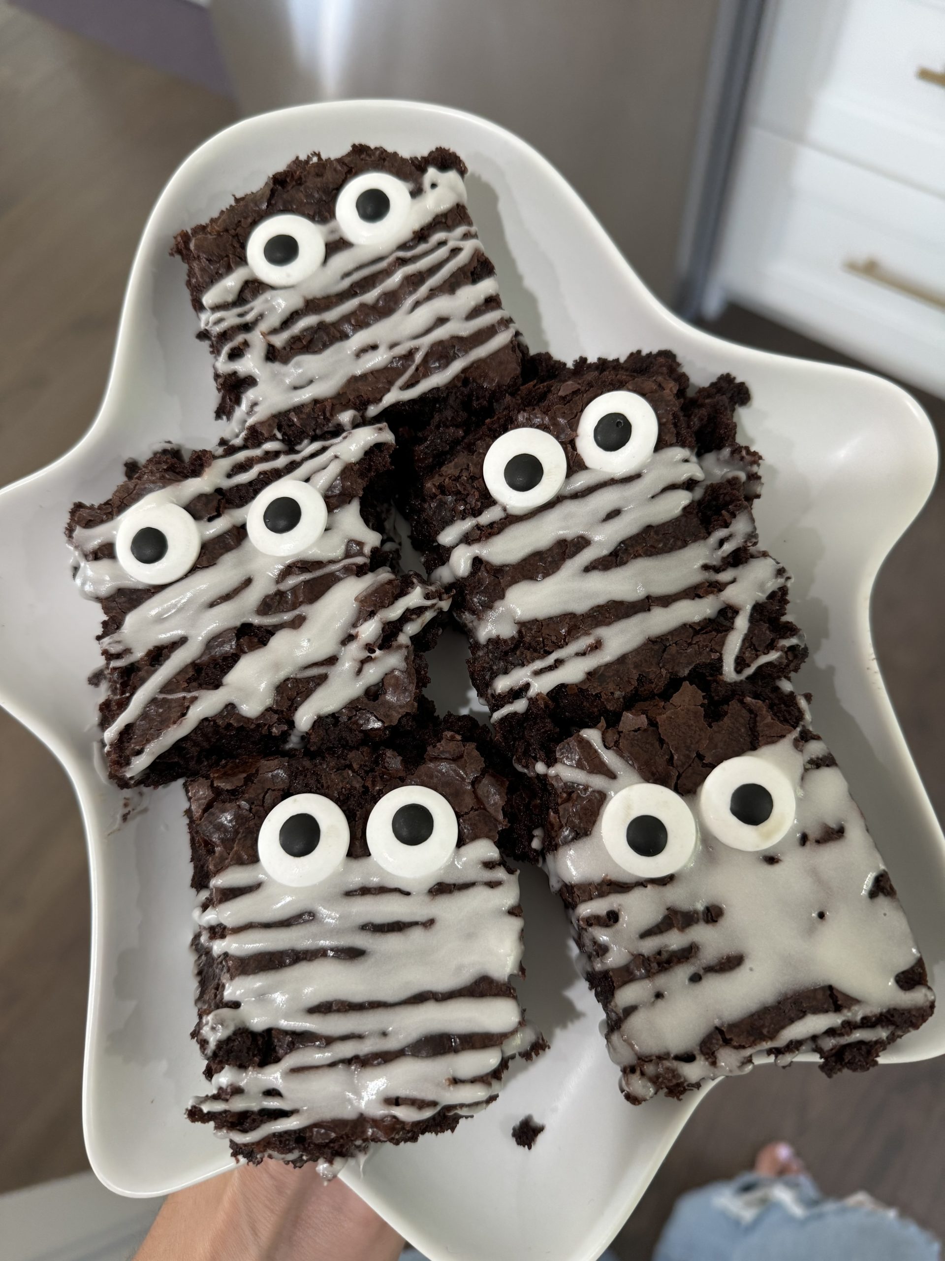 6. Attach 2 eyeballs to each brownie. Store covered in single layer at room temperature.